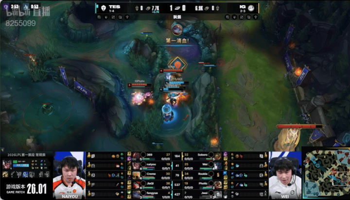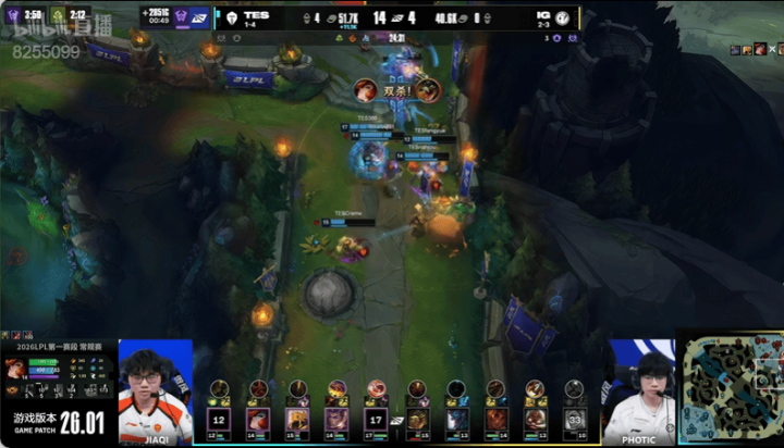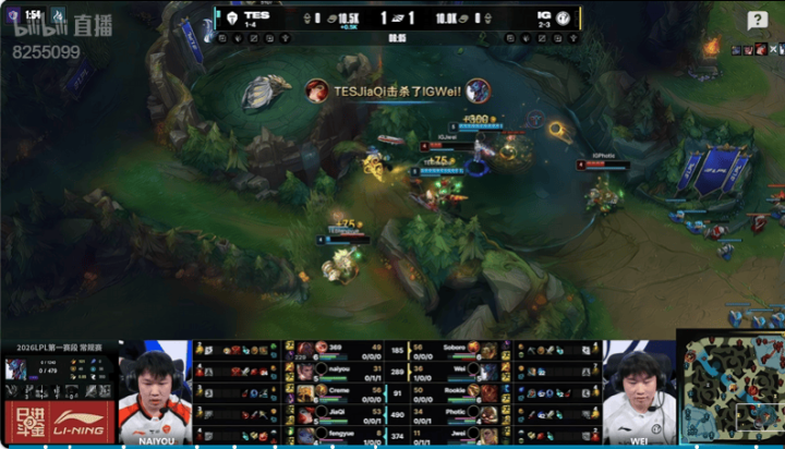 4分钟:TES入侵IG野区拿下一血,双方打出一换一