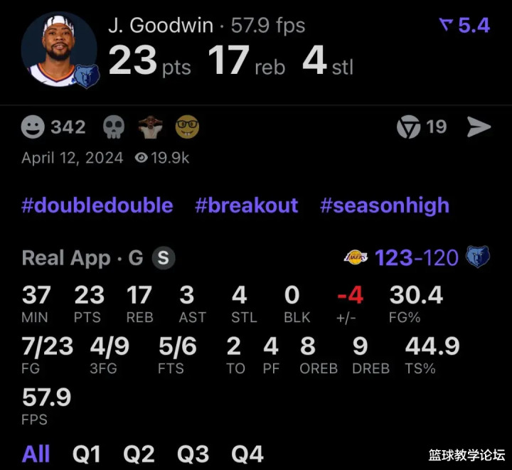 2024年夏天,灰熊没跟古德温续约。2024年9月,湖人给了古德温训练营合同,2024年10月,湖人将其裁掉。2025年2月8日,湖人用双向合同签下古德温。转正之前,他在湖人场均6.4分3.9篮板1.4助攻1.2抢断,三分命中率41.3%!