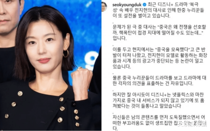 ”说得太到位了,一边想在世界面前扮“完美”,一边却连别人的海、别人的内容、别人的知识产权都要“顺手牵羊”。山寨假货、盗版影视……一桩桩事件都摆在那儿,现在却来围攻一个无辜的女演员?她不过是在剧本里念了一句台词,角色虚构、情节虚构,结果成了靶子?这逻辑简直离谱。要算账也该找编剧、找平台,找演员算什么“英雄”?说穿了,就是欺软怕硬,拿她当出气筒。支持全智贤,支持徐教授,支持所有不被带节奏的勇气!”
