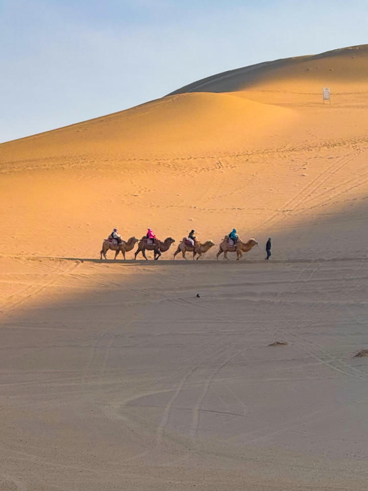 鸣沙山月牙泉也很美. 我们是下午去的, 爬沙山确实有点累, 但到了山顶看日落, 那景色绝了.月牙泉就像沙漠里的一颗明珠, 周围都是沙子, 偏偏就有这么一汪清泉, 真是神奇.