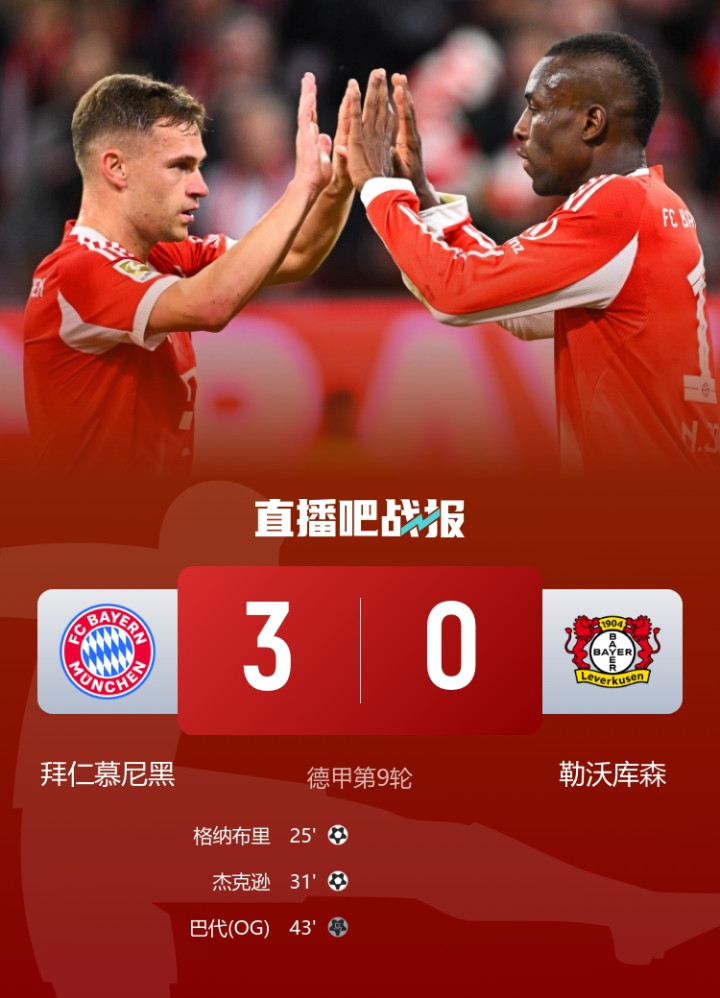 格纳布里、杰克逊破门,拜仁3-0勒沃库森豪取15连胜5分领跑。