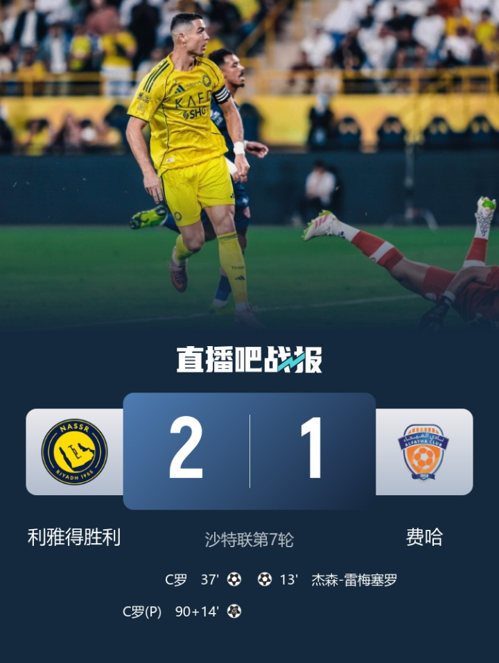 C罗双响、生涯已进952球,利雅得胜利主场2-1逆转费哈,胜利联赛开局豪取7连胜。