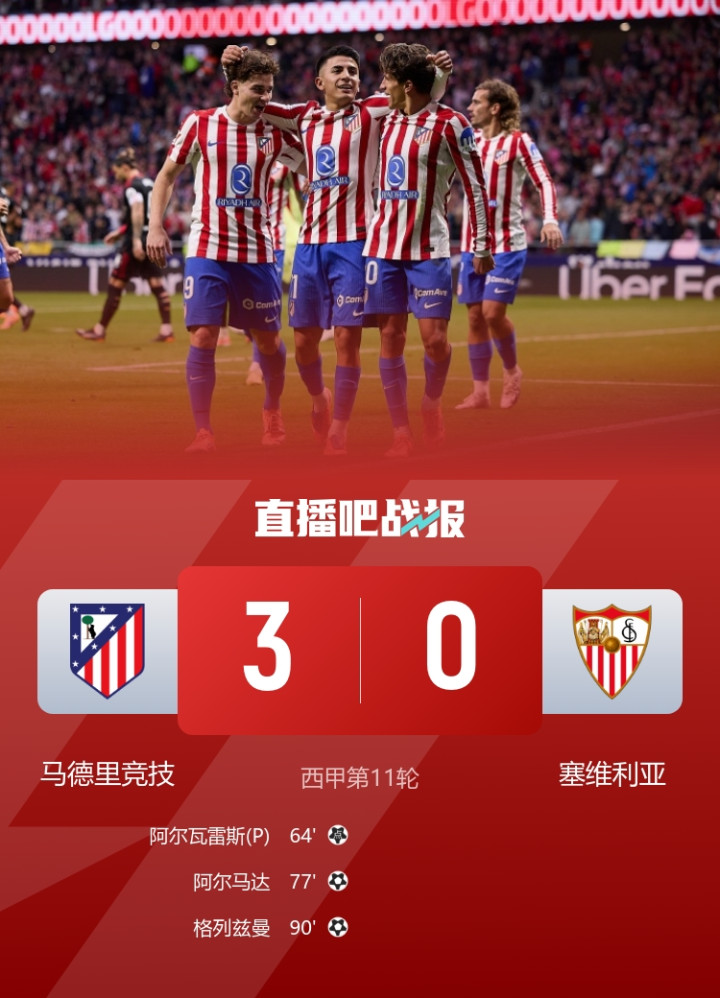 阿尔瓦雷斯点球命中,阿尔马达破门,格列兹曼建功。最终马德里竞技3-0击败塞维利亚。