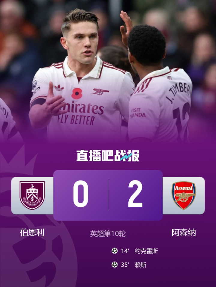 阿森纳客场2-0伯恩利,联赛5连胜7分领跑。枪手豪取各项赛事9连胜,各项赛事连续7场零封。