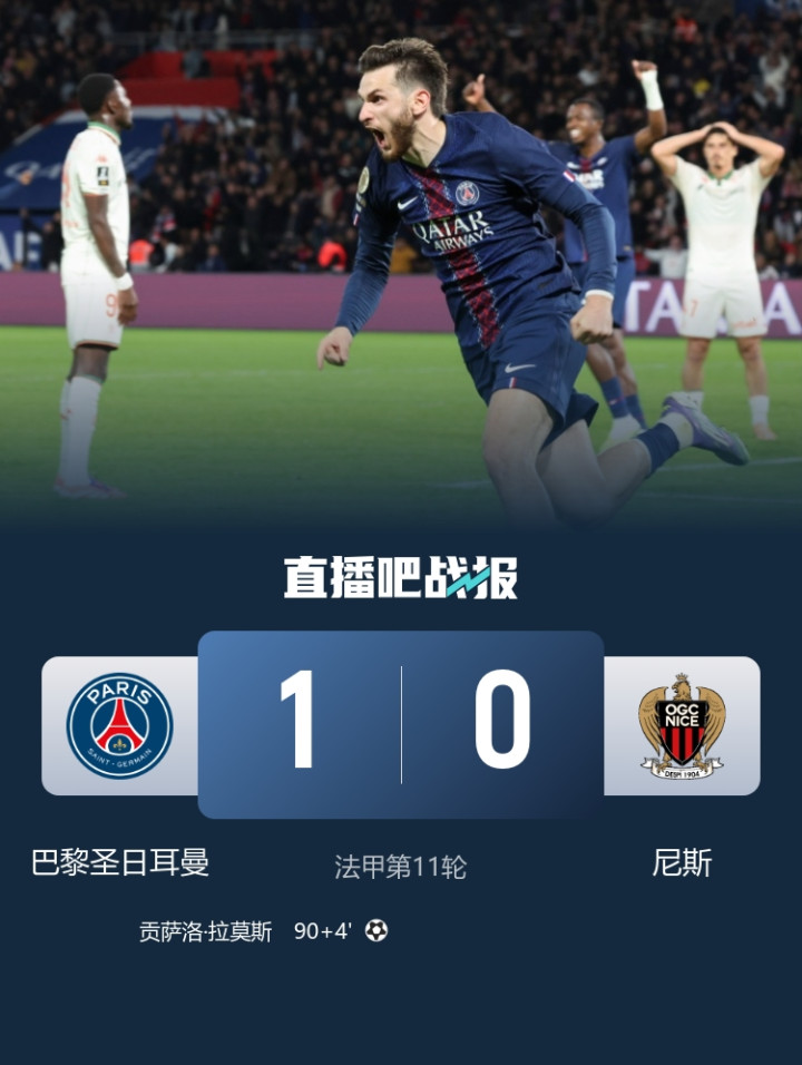 贡萨洛-拉莫斯补时绝杀,巴黎1-0击败尼斯,本轮巴黎先赛暂4分优势领跑。