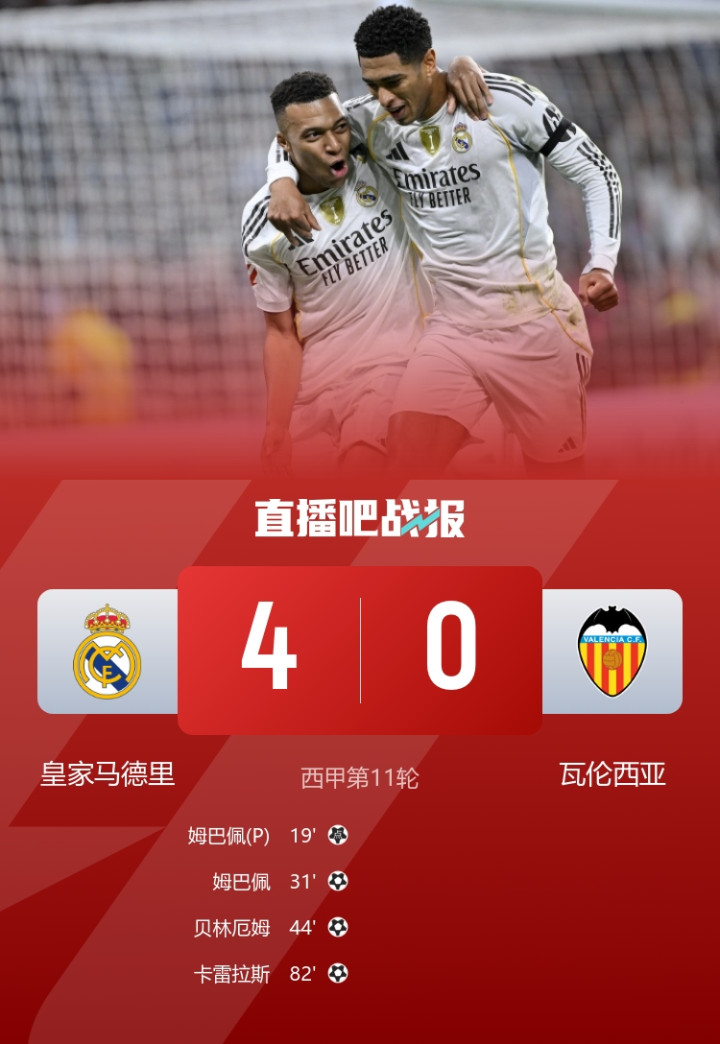 姆巴佩双响,A费世界波打进个人皇马生涯首球。最终皇马4-0瓦伦西亚,各项赛事六连胜,7分领跑积分榜。