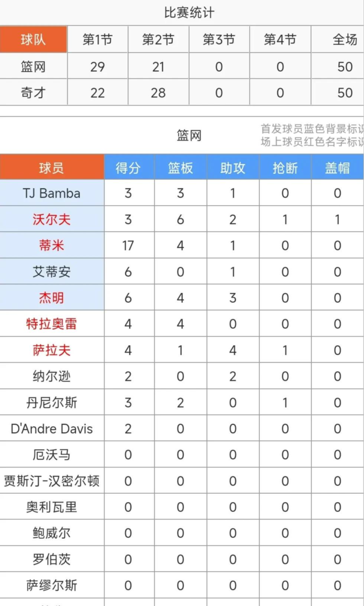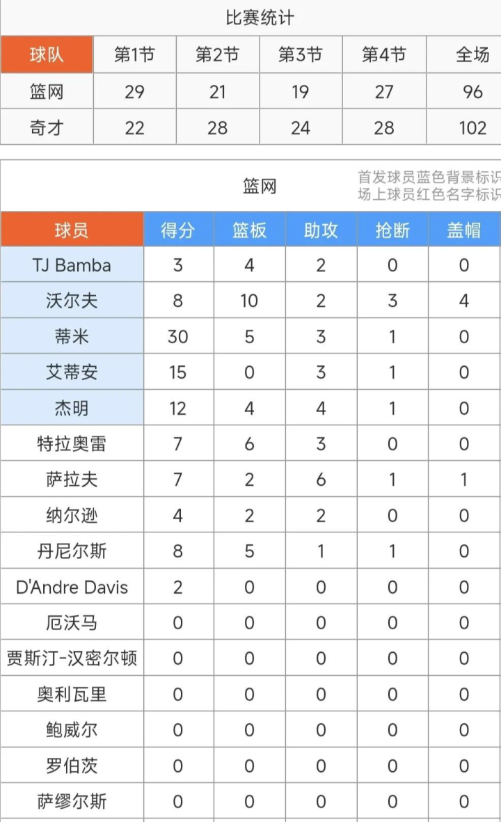 第一节开战,杰明外线六脉神剑飙中3分,特雷.约翰逊同样外线百步穿杨远射2分命中还以颜色,蒂米也是不甘示弱外线一箭穿心飙进3分给予回应,接着杀进内线勾手上篮再来2分,一个人连得5分,开局篮网队8:3领先。特雷.约翰逊突破上篮也进2分,蒂米后续跳投命中2分。双方一顿猛攻首节结束,篮网队29:22领先奇才队7分,蒂米单节砍下10分2篮板,特雷.约翰逊10分1助攻1抢断。