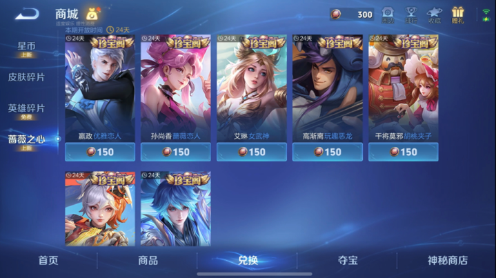 在商城英雄碎片兑换下方,新增了蔷薇之心的兑换入口。也就是说,蔷薇珍宝阁变成了常驻。也就是说,以后不再需要等到一年四次的活动来考虑是否兑换皮肤,而只需要攒够蔷薇之心就可以兑换珍宝阁的皮肤。不过,珍宝阁的皮肤目前数量比较少,而且蔷薇之心的积攒时间也太久。这个常驻,感觉意义不大。除非日后会增加蔷薇之心的日常获取渠道,而不是非要等到大活动的时候才能获得。