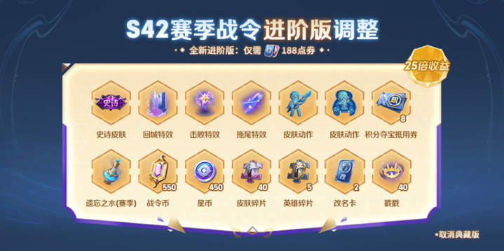 从S42赛季开始,战令将再次改版,改版之后的战令,会取消典藏版,变成赛季免费版和赛季进阶版。进阶价格从388变成了188。虽然降了,但是皮肤也是实打实少了。原来的进阶版还有一款勇者皮肤和祈光皮肤。