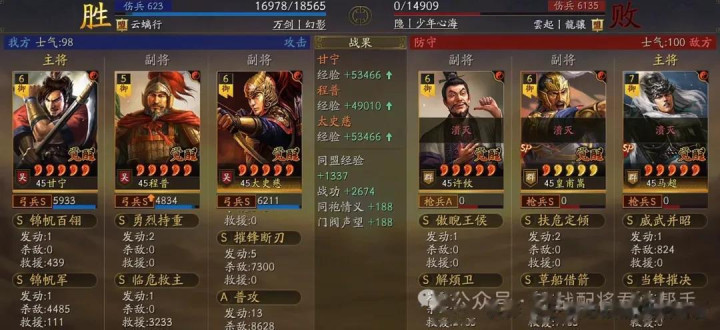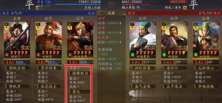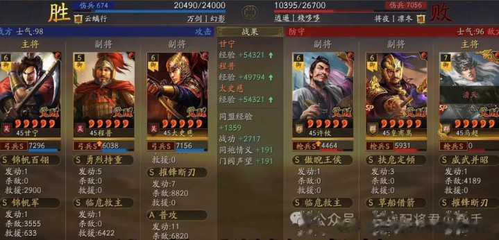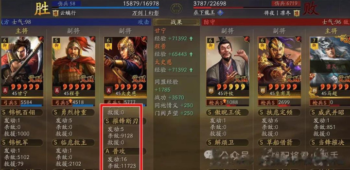 阵容实战总结:这个队伍之所以可以在汉焰长明剧本中能有这么强的杀马表现,主要还是奇谋武略的出现,极大的提高了太史慈突击战法的触发频率,从而让他的输出能力得到了质的飞越,基本上场均都能打出两万上下的伤害,甘宁携带锦帆军配合自身的普攻也能给队伍带来大几千的伤害补充能力!