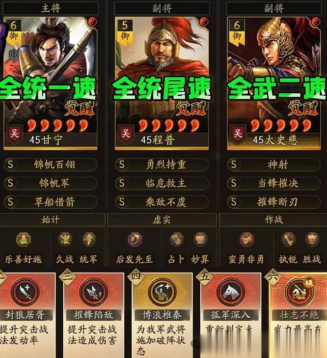 太史慈:当锋摧决+摧锋断刃(全武,速度比甘宁慢1点)