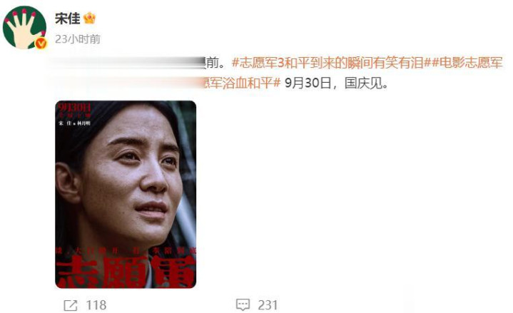 9月10号,宋女士在社交平台上发了一张海报,目的是为了宣传自己即将上映的新电影。