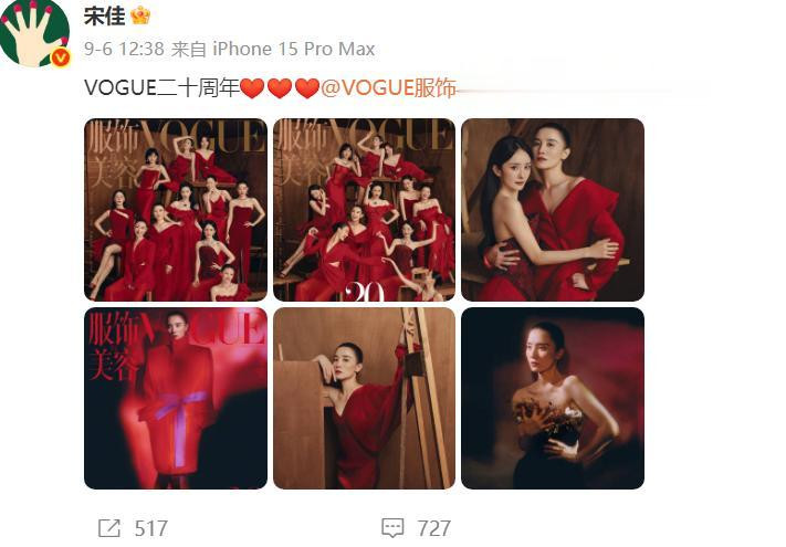 9月6号,她参与了《VOGUE》杂志二十周年封面的拍摄,这次整体的风格围绕着红色。