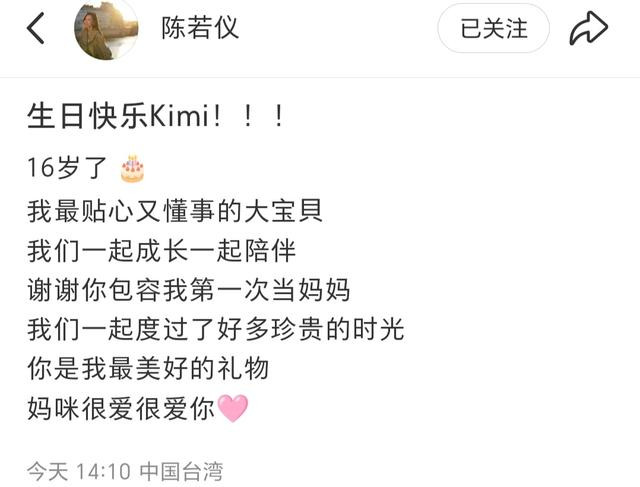 陈若仪在生日祝福中感性地回顾了Kimi这16年来的成长过程。