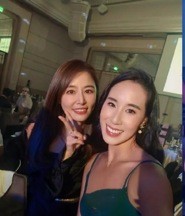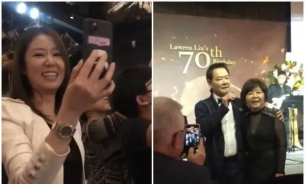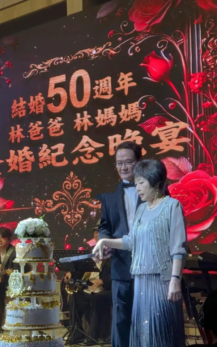 宾客陆续进场,陈美凤一来就拉着林心如的手不放,徐若瑄带着女儿也到了,薛博仁站在角落点头打招呼。大家都懂这场宴席的意义,不只是庆祝婚姻持续五十年,更是见证一段断了又续、冷了又热的感情奇迹。林爸爸林文正一身黑色西装,蝴蝶结打得一丝不苟,75岁的人站得笔直,脸上几乎没什么皱纹,和女儿站一块儿,真像差不多年纪的姐弟。旁边的黄秀琴穿着银白色套装,短发利落,耳坠一晃一晃,74岁的她看起来像刚退休的大学教授,优雅得不行。